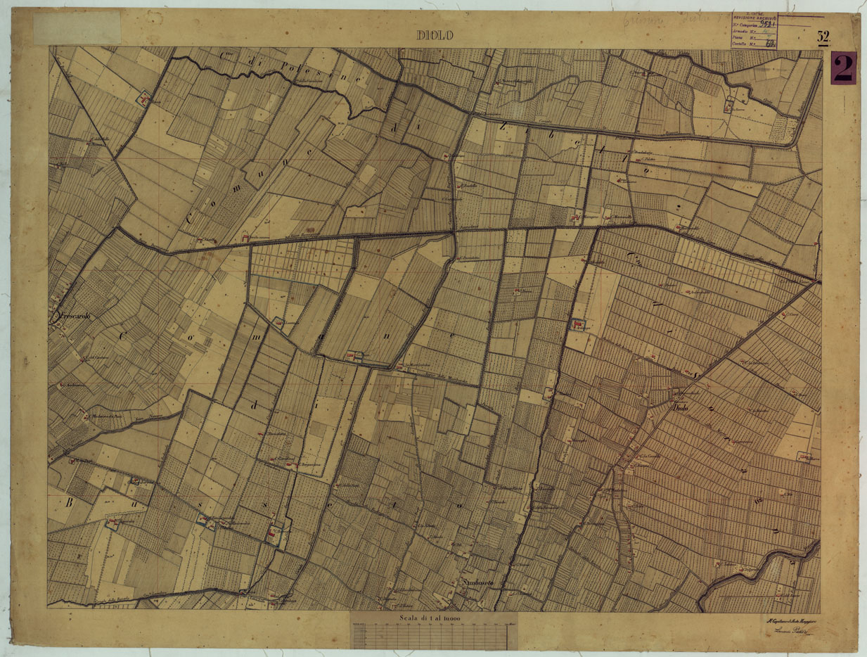 "Trentasette tavolette montate su tela disegnate ad acquerello piu un quadro d'unione. Coprono la Valle Padana da Calendasco (ovest) a S. Daniele (est) e da Cavacurta (nord) a Busseto (sud). Le acque sono colorate in azzurro. Le costruzioni sono riempite in rosso. Ciascun foglio reca la data e il nome degli operatori. Varie di queste tavolette (Piacenza e dintorni) furono riconosciute nel 1880. (v. Cart. N° 62, Docum. N° 1). Annesso un piccolo quadro d'unione con elenco di tutti gli operatori."