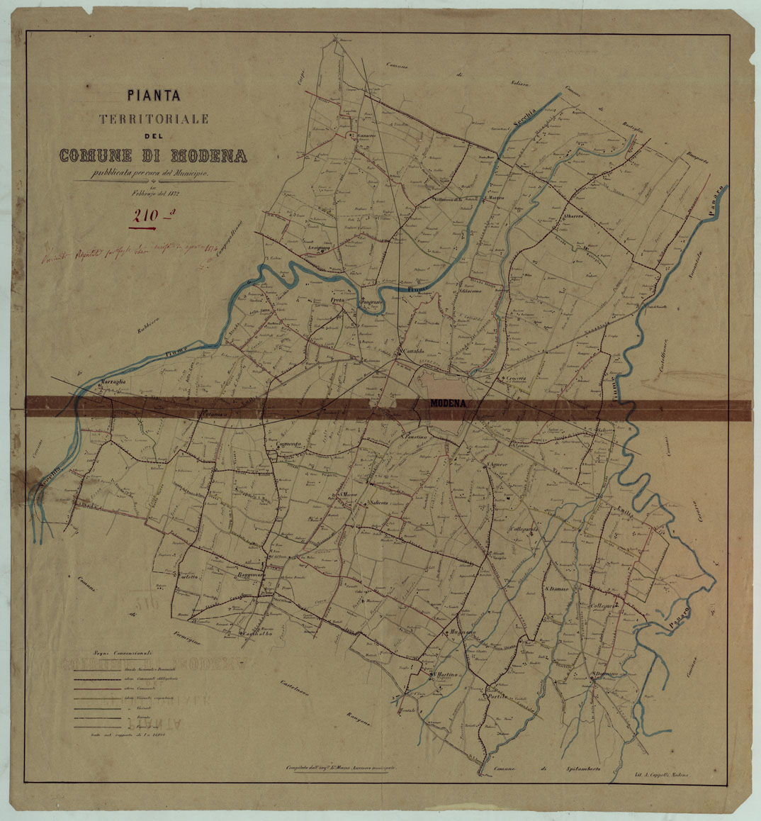 PIANTA TERRITORIALE DEL COMUNE DI MODENA PUBBLICATA PER CURA DEL MUNICIPIO IN FEBBRAIO DEL 1872.