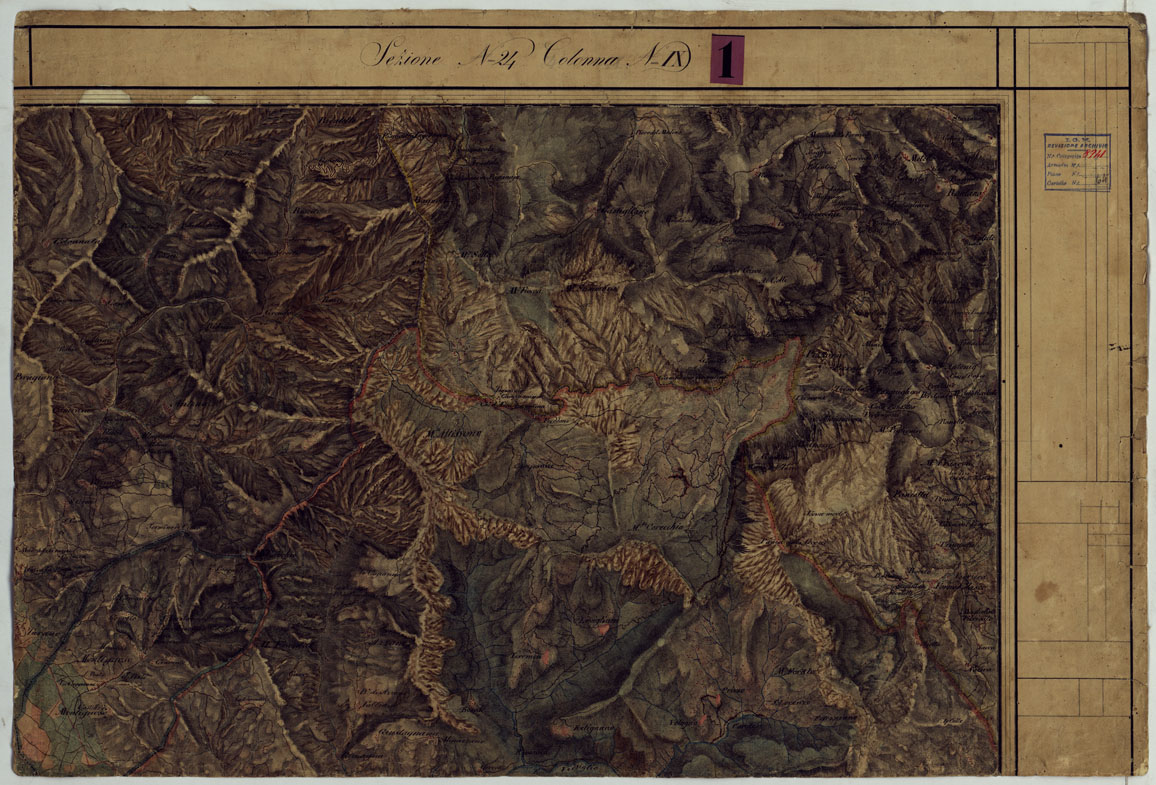 "Sono quarantacinque fogli rilevati sul terreno sotto la direzione del Magg. Carandini del Genio Modenese dal 1821 al 1828. Ad acquerello, con orografia rappresentata mediante tratteggio a luce zenitale, centri abitati e strade principali in rosso, idrografia in azzurro. A destra di ciascun foglio una colonna preparata per i dati statistici, le posizioni geografiche, ecc. in basso le firme degli ufficiali che attesero al lavoro. La carta venne incisa su rame nel 1828 dal R. I. Geogr. Milit. Austriaco in Milano e servì per la riproduzione e il disegno della carta alla scala di 1:86.400 (ved. N°10 d'ordine. Cart. d'Arch. N° 54, Docum. N°7 e 8). Alla carta è annesso un quadro d'unione. (Cnfr. Mori A., La cartografia ufficiale, ecc., pagg. 55-56). Due copie una delle quali incompleta: Docum. N° 8942. Una riduzione al 100.000 si compone di dieci fogli disegnati a colori. - Docum. N°8943). Nella Sezione 16 colonna XIII e nella Sezione 17 colonna XIII sono presenti dei fuori margine."