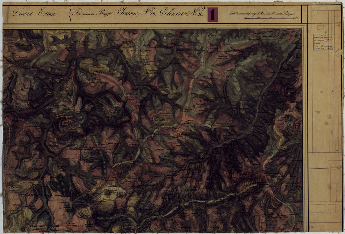 "Sono quarantacinque fogli rilevati sul terreno sotto la direzione del Magg. Carandini del Genio Modenese dal 1821 al 1828. Ad acquerello, con orografia rappresentata mediante tratteggio a luce zenitale, centri abitati e strade principali in rosso, idrografia in azzurro. A destra di ciascun foglio una colonna preparata per i dati statistici, le posizioni geografiche, ecc. in basso le firme degli ufficiali che attesero al lavoro. La carta venne incisa su rame nel 1828 dal R. I. Geogr. Milit. Austriaco in Milano e servì per la riproduzione e il disegno della carta alla scala di 1:86.400 (ved. N°10 d'ordine. Cart. d'Arch. N° 54, Docum. N°7 e 8). Alla carta è annesso un quadro d'unione. (Cnfr. Mori A., La cartografia ufficiale, ecc., pagg. 55-56). Due copie una delle quali incompleta: Docum. N° 8942. Una riduzione al 100.000 si compone di dieci fogli disegnati a colori. - Docum. N°8943). Nella Sezione 16 colonna XIII e nella Sezione 17 colonna XIII sono presenti dei fuori margine."