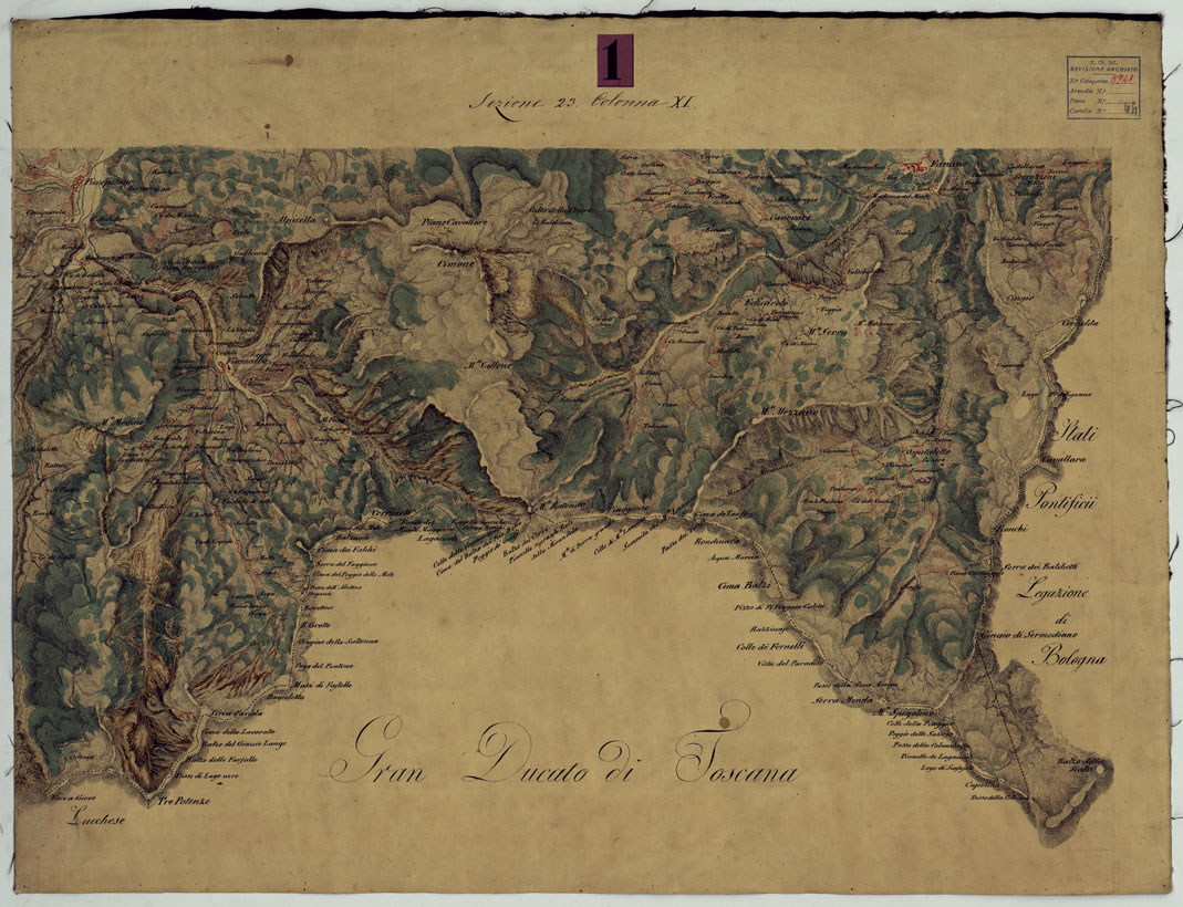 "Sono quarantacinque fogli rilevati sul terreno sotto la direzione del Magg. Carandini del Genio Modenese dal 1821 al 1828. Ad acquerello, con orografia rappresentata mediante tratteggio a luce zenitale, centri abitati e strade principali in rosso, idrografia in azzurro. A destra di ciascun foglio una colonna preparata per i dati statistici, le posizioni geografiche, ecc. in basso le firme degli ufficiali che attesero al lavoro. La carta venne incisa su rame nel 1828 dal R. I. Geogr. Milit. Austriaco in Milano e servì per la riproduzione e il disegno della carta alla scala di 1:86.400 (ved. N°10 d'ordine. Cart. d'Arch. N° 54, Docum. N°7 e 8). Alla carta è annesso un quadro d'unione. (Cnfr. Mori A., La cartografia ufficiale, ecc., pagg. 55-56). Due copie una delle quali incompleta: Docum. N° 8942. Una riduzione al 100.000 si compone di dieci fogli disegnati a colori. - Docum. N°8943). Nella Sezione 16 colonna XIII e nella Sezione 17 colonna XIII sono presenti dei fuori margine."