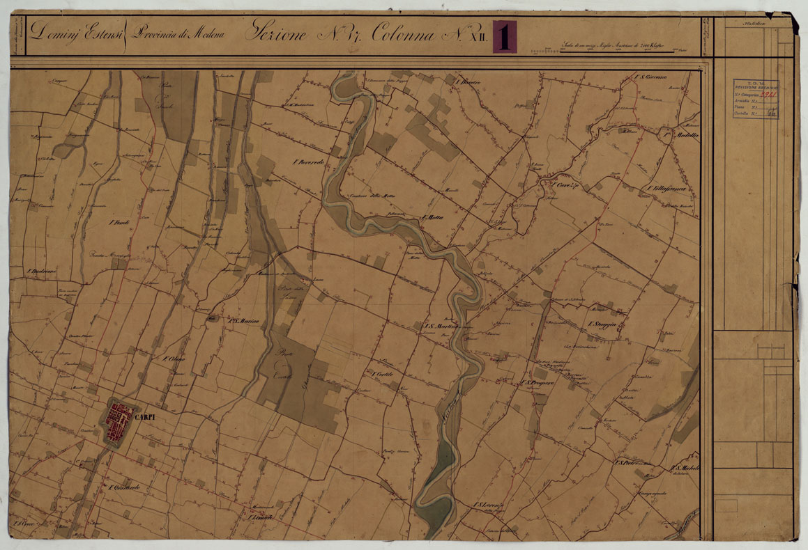 "Sono quarantacinque fogli rilevati sul terreno sotto la direzione del Magg. Carandini del Genio Modenese dal 1821 al 1828. Ad acquerello, con orografia rappresentata mediante tratteggio a luce zenitale, centri abitati e strade principali in rosso, idrografia in azzurro. A destra di ciascun foglio una colonna preparata per i dati statistici, le posizioni geografiche, ecc. in basso le firme degli ufficiali che attesero al lavoro. La carta venne incisa su rame nel 1828 dal R. I. Geogr. Milit. Austriaco in Milano e servì per la riproduzione e il disegno della carta alla scala di 1:86.400 (ved. N°10 d'ordine. Cart. d'Arch. N° 54, Docum. N°7 e 8). Alla carta è annesso un quadro d'unione. (Cnfr. Mori A., La cartografia ufficiale, ecc., pagg. 55-56). Due copie una delle quali incompleta: Docum. N° 8942. Una riduzione al 100.000 si compone di dieci fogli disegnati a colori. - Docum. N°8943). Nella Sezione 16 colonna XIII e nella Sezione 17 colonna XIII sono presenti dei fuori margine."