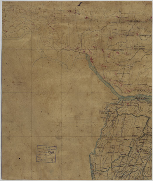"Sono quarantotto fogli rilevati sul terreno sotto la direzione del Magg. Carandini del Genio Modenese dal 1821 al 1828. Ad acquerello, con orografia rappresentata mediante tratteggio a luce zenitale, centri abitati e strade principali in rosso, idrografia in azzurro. A destra di ciascun foglio una colonna preparata per i dati statistici, le posizioni geografiche, ecc. in basso le firme degli ufficiali che attesero al lavoro. La carta venne incisa su rame nel 1828 dal R. I. Geogr. Milit. Austriaco in Milano e servì per la riproduzione e il disegno della carta alla scala di 1:86.400 (ved. N°10 d'ordine. Cart. d'Arch. N° 54, Docum. N°7 e 8). Alla carta è annesso un quadro d'unione. (Cnfr. Mori A., La cartografia ufficiale, ecc., pagg. 55-56). Due copie una delle quali incompleta: Docum. N° 8942. Una riduzione al 100.000 si compone di dieci fogli disegnati a colori. Docum. N°8943 si compone di 9 fogli più un quadro d'unione. Nella Sezione 16 colonna XIII e nella Sezione 17 colonna XIII ,sono presenti dei fuori margine."