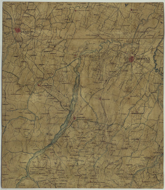 "Sono quarantotto fogli rilevati sul terreno sotto la direzione del Magg. Carandini del Genio Modenese dal 1821 al 1828. Ad acquerello, con orografia rappresentata mediante tratteggio a luce zenitale, centri abitati e strade principali in rosso, idrografia in azzurro. A destra di ciascun foglio una colonna preparata per i dati statistici, le posizioni geografiche, ecc. in basso le firme degli ufficiali che attesero al lavoro. La carta venne incisa su rame nel 1828 dal R. I. Geogr. Milit. Austriaco in Milano e servì per la riproduzione e il disegno della carta alla scala di 1:86.400 (ved. N°10 d'ordine. Cart. d'Arch. N° 54, Docum. N°7 e 8). Alla carta è annesso un quadro d'unione. (Cnfr. Mori A., La cartografia ufficiale, ecc., pagg. 55-56). Due copie una delle quali incompleta: Docum. N° 8942. Una riduzione al 100.000 si compone di dieci fogli disegnati a colori. Docum. N°8943 si compone di 9 fogli più un quadro d'unione. Nella Sezione 16 colonna XIII e nella Sezione 17 colonna XIII ,sono presenti dei fuori margine."
