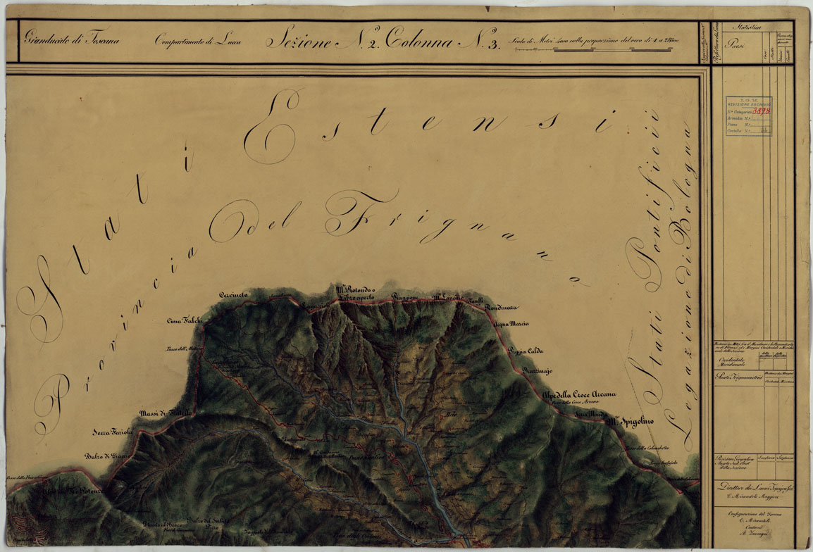 CARTA TOPOGRAFICA DEL COMPARTIMENTO LUCCHESE ESEGUITA D'ORDINE DI SUA ECCELLENZA IL SIGNOR TENENTE GENERALE CAV. G. DE LAUGIER CONTE DI BELLECOUR MINISTRO DELLA GUERRA - SEZIONE N. 2 COLONNA N. 3