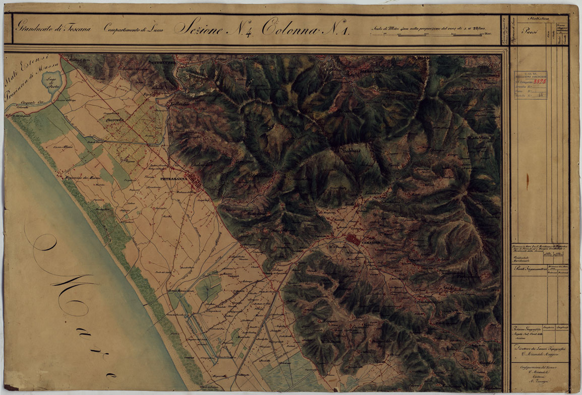 CARTA TOPOGRAFICA DEL COMPARTIMENTO LUCCHESE ESEGUITA D'ORDINE DI SUA ECCELLENZA IL SIGNOR TENENTE GENERALE CAV. G. DE LAUGIER CONTE DI BELLECOUR MINISTRO DELLA GUERRA - SEZIONE N. 4 COLONNA N. 1.
