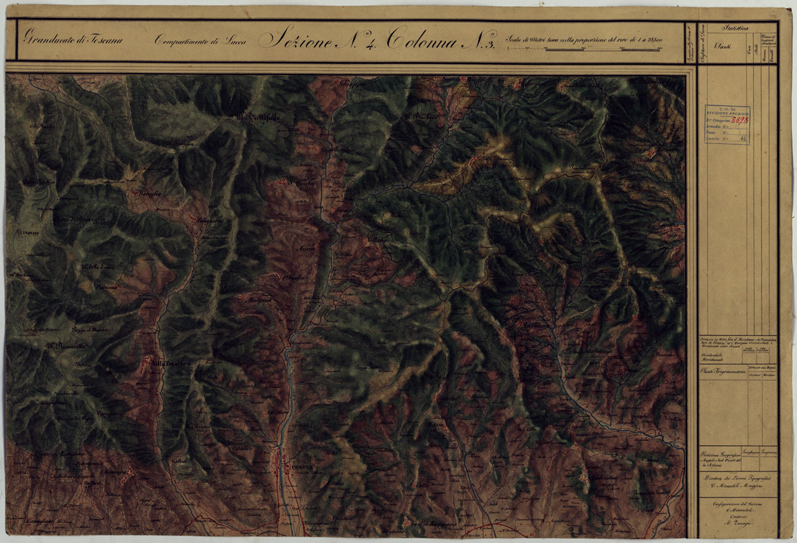 CARTA TOPOGRAFICA DEL COMPARTIMENTO LUCCHESE ESEGUITA D'ORDINE DI SUA ECCELLENZA IL SIGNOR TENENTE GENERALE CAV. G. DE LAUGIER CONTE DI BELLECOUR MINISTRO DELLA GUERRA - SEZIONE N. 4 COLONNA N. 3