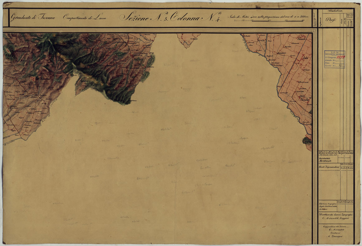 CARTA TOPOGRAFICA DEL COMPARTIMENTO LUCCHESE ESEGUITA D'ORDINE DI SUA ECCELLENZA IL SIGNOR TENENTE GENERALE CAV. G. DE LAUGIER CONTE DI BELLECOUR MINISTRO DELLA GUERRA - SEZIONE N. 5 COLONNA N. 4
