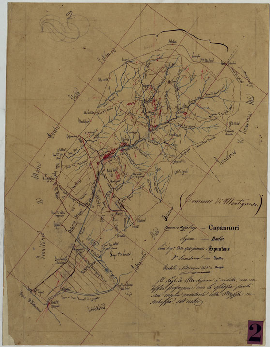 "Sono sessantanove pezzi, disegnati su carta lucida e montati su carta solida. Disegni ricavati da catasti riconosciuti sul terreno: rappresentano l'abbozzo della sola planimetria a colori, azzurro per l'idrografia, rosso per i centri abitati e la rete stradale. Tre fogli più completi, quelli di Fucecchio, Rosignano e Calenzano, rappresentano l'orografia mediante tratteggio a luce zenitale. Sono datati al 1858 e recano la firma del Capitano L. Valle, succeduto al Mirandoli nella direzione dell'Uffizio Topografico Militare. (Cfr. Mori A. La cartografia ufficiale, ecc., pagg 71-72)."