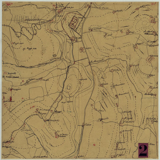 "Sono sessantanove pezzi, disegnati su carta lucida e montati su carta solida. Disegni ricavati da catasti riconosciuti sul terreno: rappresentano l'abbozzo della sola planimetria a colori, azzurro per l'idrografia, rosso per i centri abitati e la rete stradale. Tre fogli più completi, quelli di Fucecchio, Rosignano e Calenzano, rappresentano l'orografia mediante tratteggio a luce zenitale. Sono datati al 1858 e recano la firma del Capitano L. Valle, succeduto al Mirandoli nella direzione dell'Uffizio Topografico Militare. (Cfr. Mori A. La cartografia ufficiale, ecc., pagg 71-72)."
