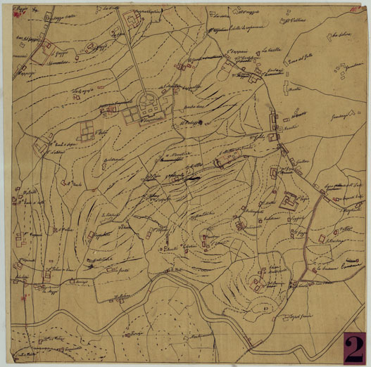 "Sono sessantanove pezzi, disegnati su carta lucida e montati su carta solida. Disegni ricavati da catasti riconosciuti sul terreno: rappresentano l'abbozzo della sola planimetria a colori, azzurro per l'idrografia, rosso per i centri abitati e la rete stradale. Tre fogli più completi, quelli di Fucecchio, Rosignano e Calenzano, rappresentano l'orografia mediante tratteggio a luce zenitale. Sono datati al 1858 e recano la firma del Capitano L. Valle, succeduto al Mirandoli nella direzione dell'Uffizio Topografico Militare. (Cfr. Mori A. La cartografia ufficiale, ecc., pagg 71-72)."