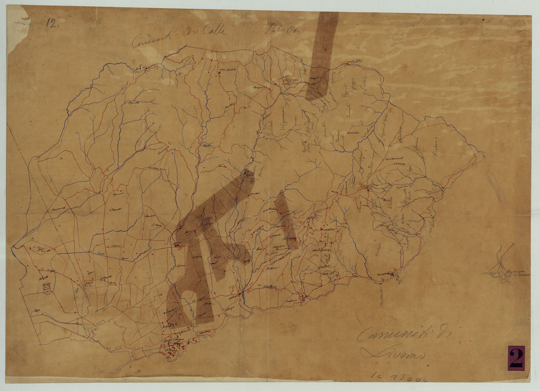 "Sono sessantanove pezzi, disegnati su carta lucida e montati su carta solida. Disegni ricavati da catasti riconosciuti sul terreno: rappresentano l'abbozzo della sola planimetria a colori, azzurro per l'idrografia, rosso per i centri abitati e la rete stradale. Tre fogli più completi, quelli di Fucecchio, Rosignano e Calenzano, rappresentano l'orografia mediante tratteggio a luce zenitale. Sono datati al 1858 e recano la firma del Capitano L. Valle, succeduto al Mirandoli nella direzione dell'Uffizio Topografico Militare. (Cfr. Mori A. La cartografia ufficiale, ecc., pagg 71-72)."