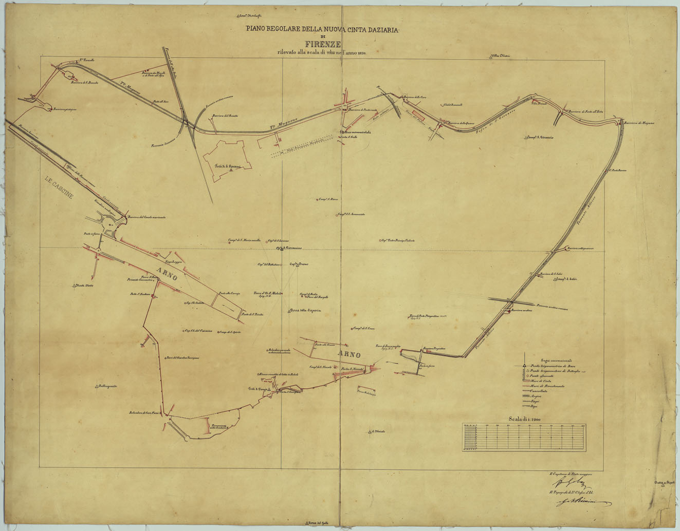 "Un foglio disegnato e montato su tela, rilevato alla scala di 1:7.500 nell'anno 1870. A questo documento appartiene anche il disegno "Pianta della città di Firenze ""