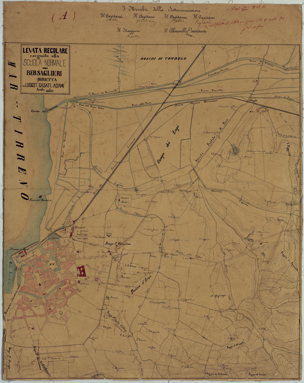 "Minuta di campagna montata su tela, eseguita nel 1873. Rappresenta l'orografia con curve di livello abitati in rossso acque in azzurro."