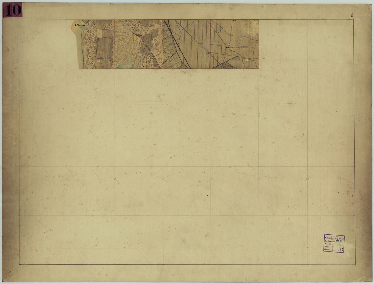 "Sette minute di campagna, montate su cartone, dei rilevamenti eseguiti nel 1862, alla scala di 1:10.000 da Ufficiali di S. M. Rappresentano l'orografia a curve di livello tracciate all'equidistanza di m. 5, gli abitati in rosso, le acque in azzurro. Annesso un quadro d'unione con i nomi degli operatori e una busta contenente sette piccoli disegni."