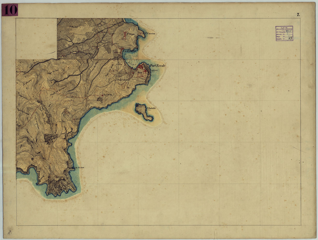 "Sette minute di campagna, montate su cartone, dei rilevamenti eseguiti nel 1862, alla scala di 1:10.000 da Ufficiali di S. M. Rappresentano l'orografia a curve di livello tracciate all'equidistanza di m. 5, gli abitati in rosso, le acque in azzurro. Annesso un quadro d'unione con i nomi degli operatori e una busta contenente sette piccoli disegni."