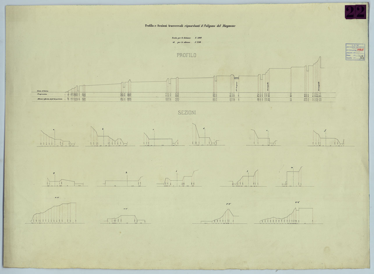 "I) Profilo e sezioni traversali riguardanti il poligono del Mugnone (Firenze) Scala per le distanze 1:500 per le altezze 1:250. II) Rilievo originale firmato G. Marenzi (I.G.M.), alla scala di 1:1.000. 1899."