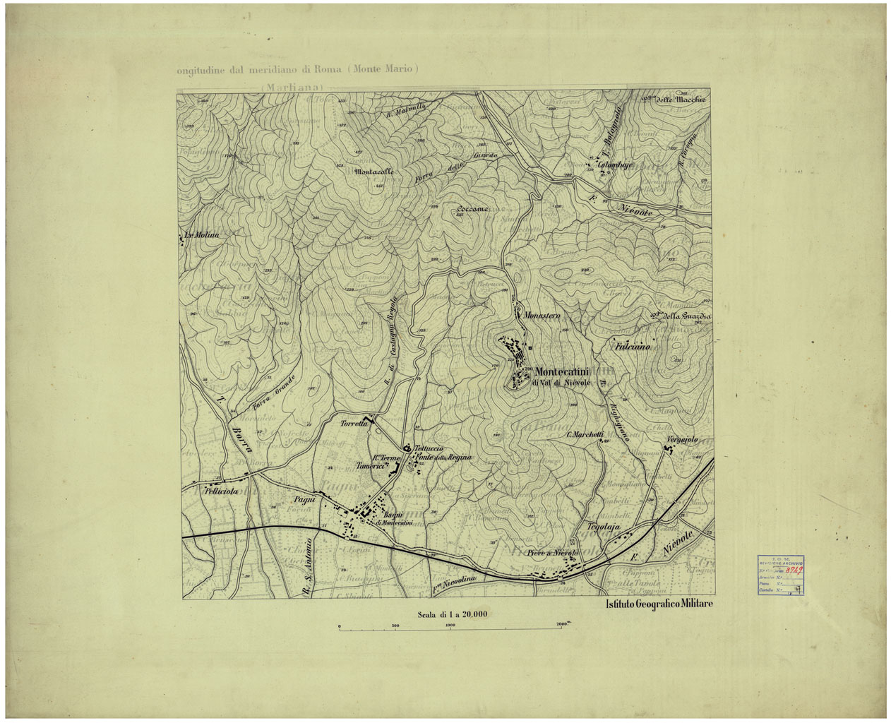 "Originale alla scala di 1:10.000, su calco bleu, per la riduzione al 20.000. I.G.M., 1909. Un foglio montato su cartone. Orografia a curve di livello. Cfr. anche il Doc. 17 è analogo a questo."