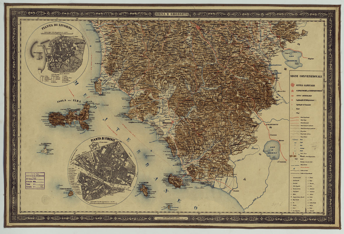 "Tre fogli montati su tela a stacchi e contenuti in busta. Stampa a colori, bistro per l´orografia (sfumo), azzurro per le acque, rosso per gli abitati (distinti in base alla loro importanza amministrativa) e per le strade principali, verde per i confini. La carta è assai ricca di segni convenzionali di cui è data apposita leggenda nel foglio meridionale. Esso contiene anche le piantine di Firenze e di Livorno alle scale rispettive di 1:20.000 e di 1:28.000. La carta è derivata da quella dell'Inghirami (N°35 d' Ordine - Cartella d'Archivio n. 69 - Docum. n.3). Alla copia contenuta nella Cart. d'Archivio n. 69 (Docum. n. 4) si aggiunge un secondo foglio settentrionale con la sola planimetria e parte dei territori amministrativi a colori."