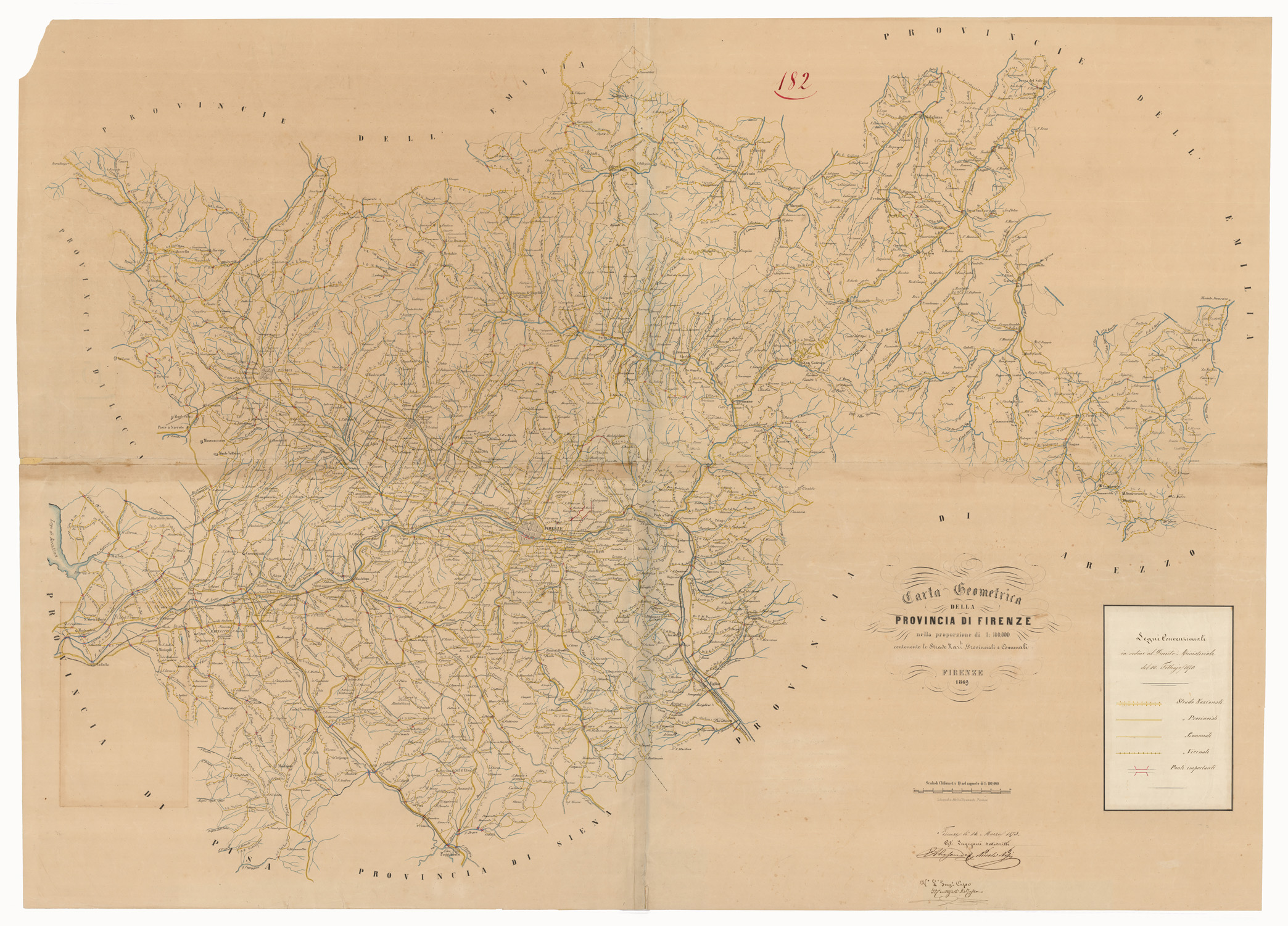 CARTA GEOMETRICA DELLA PROVINCIA DI FIRENZE NELLE PROPORZIONI DI 1:100.000 CONTENENTE LE STRADE NAZIONALI, PROVINCIALI E COMUNALI. FIRENZE 186... LITOGRAFIA ATTILIO BRAMANTI. FIRENZE.