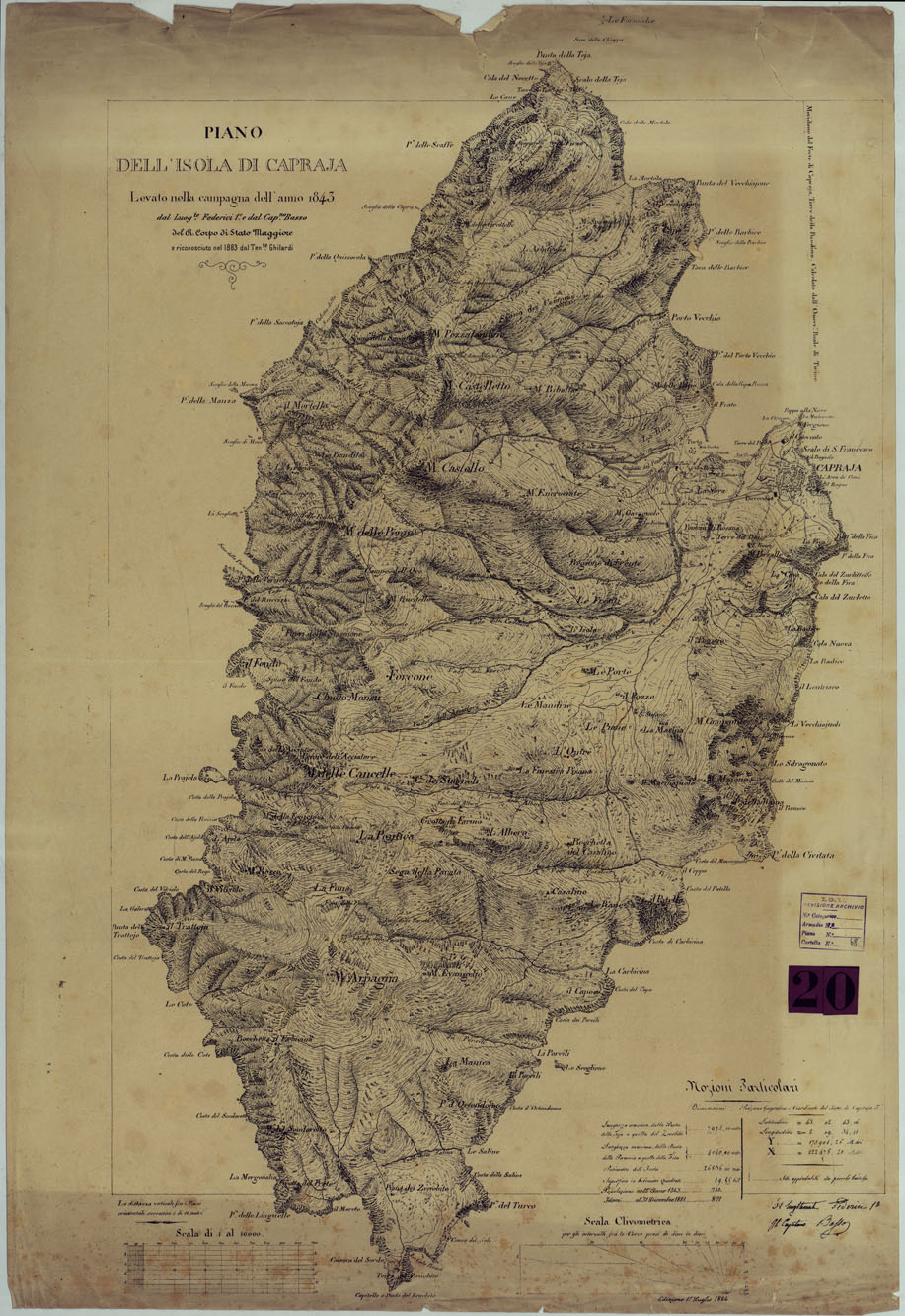 PIANO DELL'ISOLA DI CAPRAIA LEVATO NELLA CAMPAGNA DELL'ANNO 1843 DAL LUOG.TE FEDERICI 1° DAL CAP.NO BASSO DEL R. CORPO DI STATO AMGGIORE E RICONOSCIUTO NEL 1883 DAL TEN.TE GHILARDI.