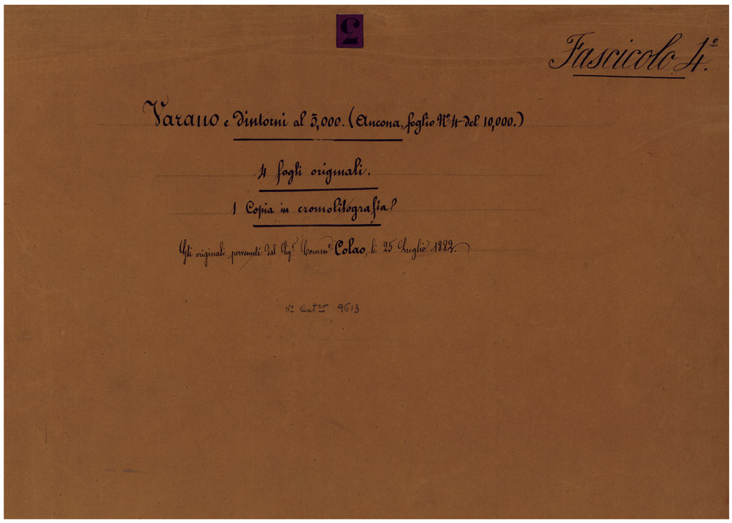 "Docum. n. 3. (Varano). Quattro fogli disegnati con orografia a curve di livello tracciate all'equidistanza di 5 m. Essi servirono per la carta, ivi annessa, in fotolito, a curve e sfumo. Si ritengono eseguiti per manovre militari dagli ufficiali del Presidio di Ancona. Annesso un piccolo quadro d'unione con leggenda dei segni convenzionali. Sono tracciate le ferrovie: le strade sono distinte in 5 classi: sono inoltre indicati i vari tipi di vegetazione e di colture. Cfr. anche la copia litografica al Docum. 1 - Cart. d'Arch. 70 "Varano e Dintorni"."