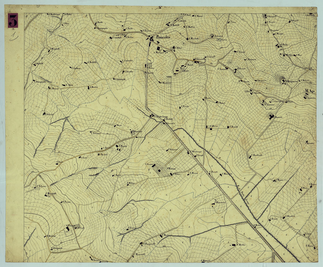 "Docum. n. 3. (Varano). Quattro fogli disegnati con orografia a curve di livello tracciate all'equidistanza di 5 m. Essi servirono per la carta, ivi annessa, in fotolito, a curve e sfumo. Si ritengono eseguiti per manovre militari dagli ufficiali del Presidio di Ancona. Annesso un piccolo quadro d'unione con leggenda dei segni convenzionali. Sono tracciate le ferrovie: le strade sono distinte in 5 classi: sono inoltre indicati i vari tipi di vegetazione e di colture. Cfr. anche la copia litografica al Docum. 1 - Cart. d'Arch. 70 "Varano e Dintorni"."