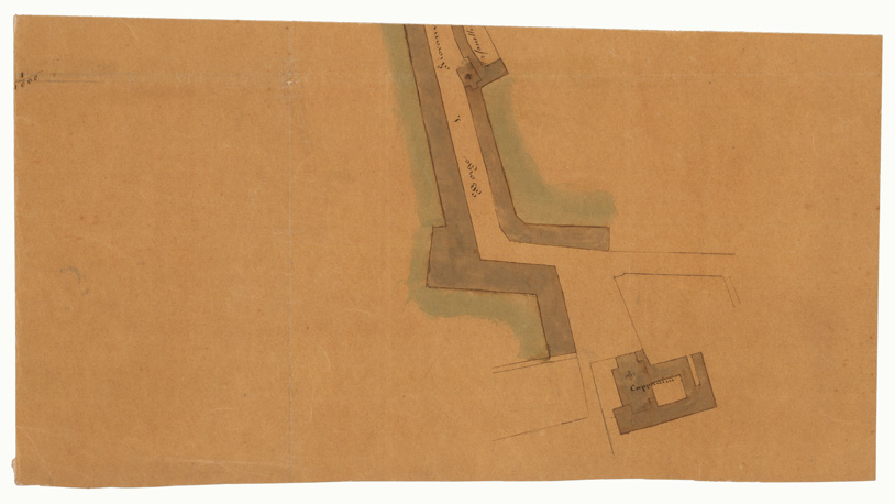 "Docum. n. 8. Disegno ad acquerello su carta vegetale montato su carta senza data né firma. Epoca supposta prima metà del secolo XIX."