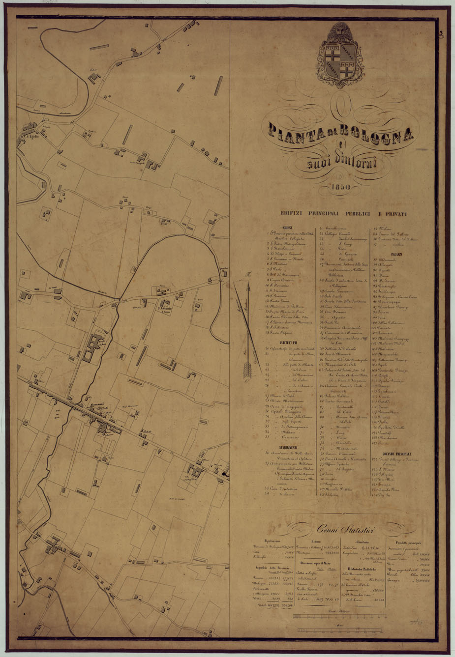 "Docum. n. 2. Tre fogli incisi su rame e montati su tela, stampati in Bologna dall'editore Giacomo Monti. Il foglio orientale contiene il titolo, l'elenco numerico degli edifici principali pubblici e privati e brevi cenni statistici."