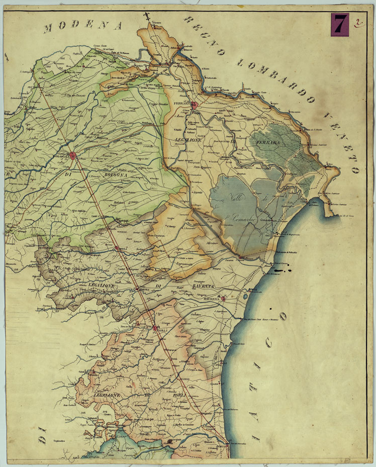 CARTA COROGRAFICA DELLO STATO PONTIFICIO INDICANTE LE DOGANE I POSTI ARMATI DALLA TRUPPA DI FINANZA, LE STRADE DOGANALI, LA FASCIA BIMILIARE DI DIVIETO E LE DOGANE ESTERE CHE CORRISPONDONO ALLE PONTIFICIE.