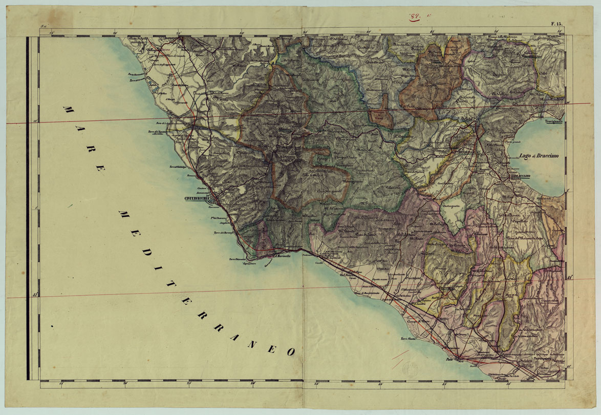 "Dodici fogli estendentisi da Radicofani (nord) a Terracina (sud) dal Lago di Fucino (est) al Monte Argentario (ovest). Riproduzione autografica con colori a mano per le circoscrizioni. Uno dei fogli contiene un prospetto di quote altimetriche di vari punti trigonometrici nel Granducato di Toscana. Epoca metà del XIX secolo."