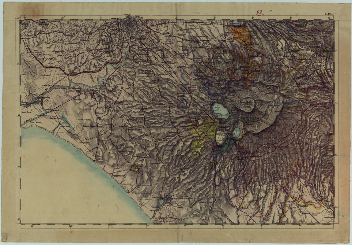 "Dodici fogli estendentisi da Radicofani (nord) a Terracina (sud) e dal Lago di Fucino (est) al Monte Argentario (ovest). Riproduzione autografica con colori a mano per le circoscrizioni. Uno dei fogli contiene un prospetto di quote altimetriche di vari punti trigonometrici. nel Granducato di Toscana. "