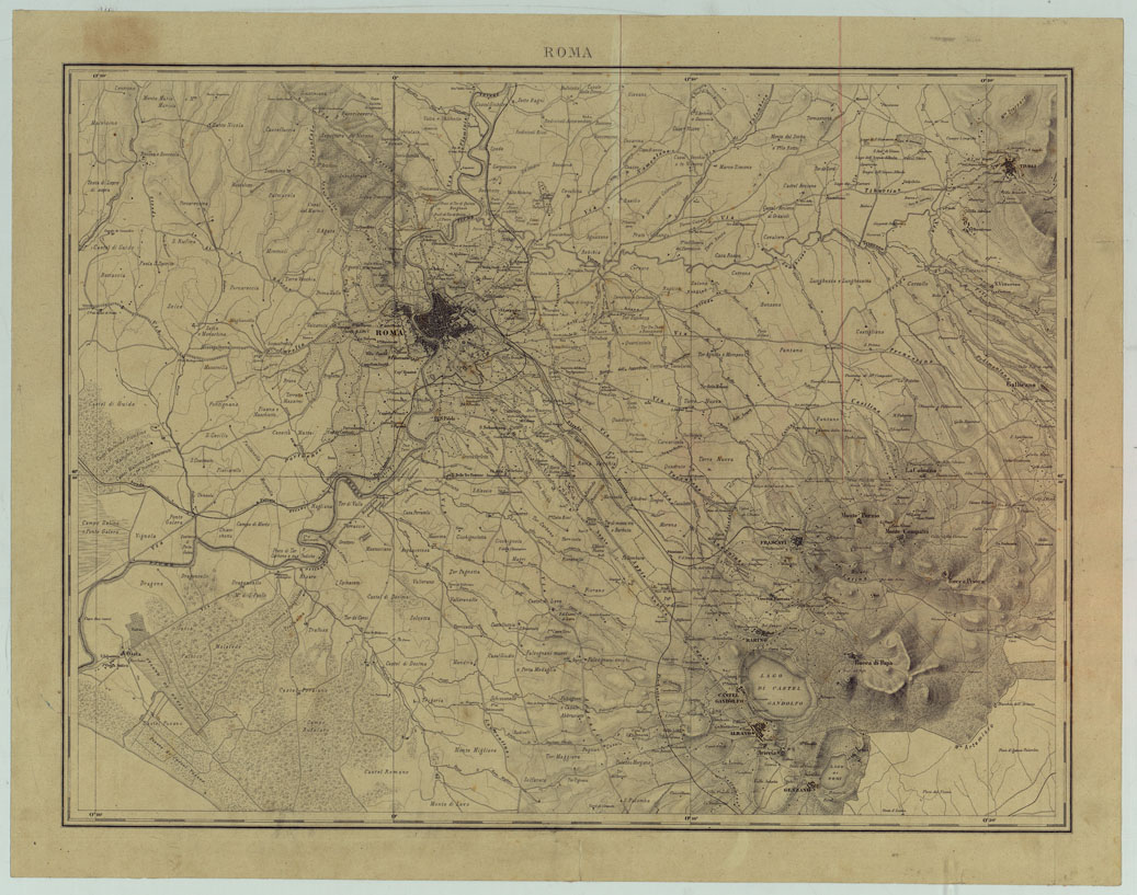 "Carta in nove fogli (dei quali uno per il titolo) incisi su rame alla Calcografia Camerale. I titoli sono: Roma, Civita-Castellana, Civita - Vecchia, Nettuno, Palo, Subiaco, Arsoli, Cisterna. Le longitudini sono calcolate dal meridiano della Cupola di S. Pietro in Vaticano. Ciascun foglio contiene 19' di latitudine e 34' di longitudine. La carta è basata sui rilievi catastali eseguiti in seguito al motu proprio del 1816. Fu pubblicata nel 1845. L'orografia è rappresentata con fine tratteggio a luce zenitale. Gli abitati sono distinti in base alla loro importanza amministrativa. Le strade sono distinte in sei classi comprese le ferrovie. Sono indicati i confini politici e amministrativi, i boschi, i vigneti, le saline, i punti trigonometrici, ecc. il foglio N° 1 contiene il titolo, la leggenda dei segni convenzionali, il quadro d'unione e le scale grafiche. Cfr. MORI A. La cartografia ufficiale in Italia e l'I.G.M., pag. 79. Quattro copie una delle quali montata su tela a stacchi. Carte uguali a questa si trovano inBiblioteca al n. 212 d'inventario generale ed al n. 4080 bis."