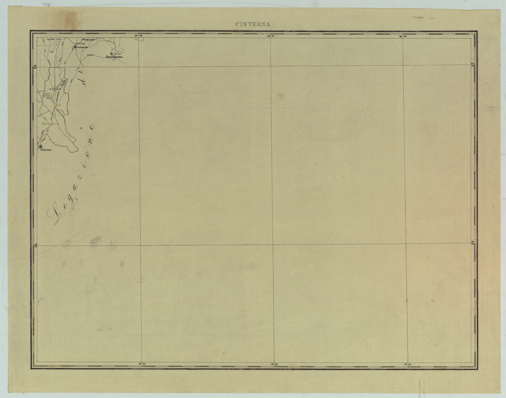 "Carta in nove fogli (dei quali uno per il titolo) incisi su rame alla Calcografia Camerale. I titoli sono: Roma, Civita-Castellana, Civita - Vecchia, Nettuno, Palo, Subiaco, Arsoli, Cisterna. Le longitudini sono calcolate dal meridiano della Cupola di S. Pietro in Vaticano. Ciascun foglio contiene 19' di latitudine e 34' di longitudine. La carta è basata sui rilievi catastali eseguiti in seguito al motu proprio del 1816. Fu pubblicata nel 1845. L'orografia è rappresentata con fine tratteggio a luce zenitale. Gli abitati sono distinti in base alla loro importanza amministrativa. Le strade sono distinte in sei classi comprese le ferrovie. Sono indicati i confini politici e amministrativi, i boschi, i vigneti, le saline, i punti trigonometrici, ecc. il foglio N° 1 contiene il titolo, la leggenda dei segni convenzionali, il quadro d'unione e le scale grafiche. Cfr. MORI A. La cartografia ufficiale in Italia e l'I.G.M., pag. 79. Quattro copie una delle quali montata su tela a stacchi. Carte uguali a questa si trovano inBiblioteca al n. 212 d'inventario generale ed al n. 4080 bis."