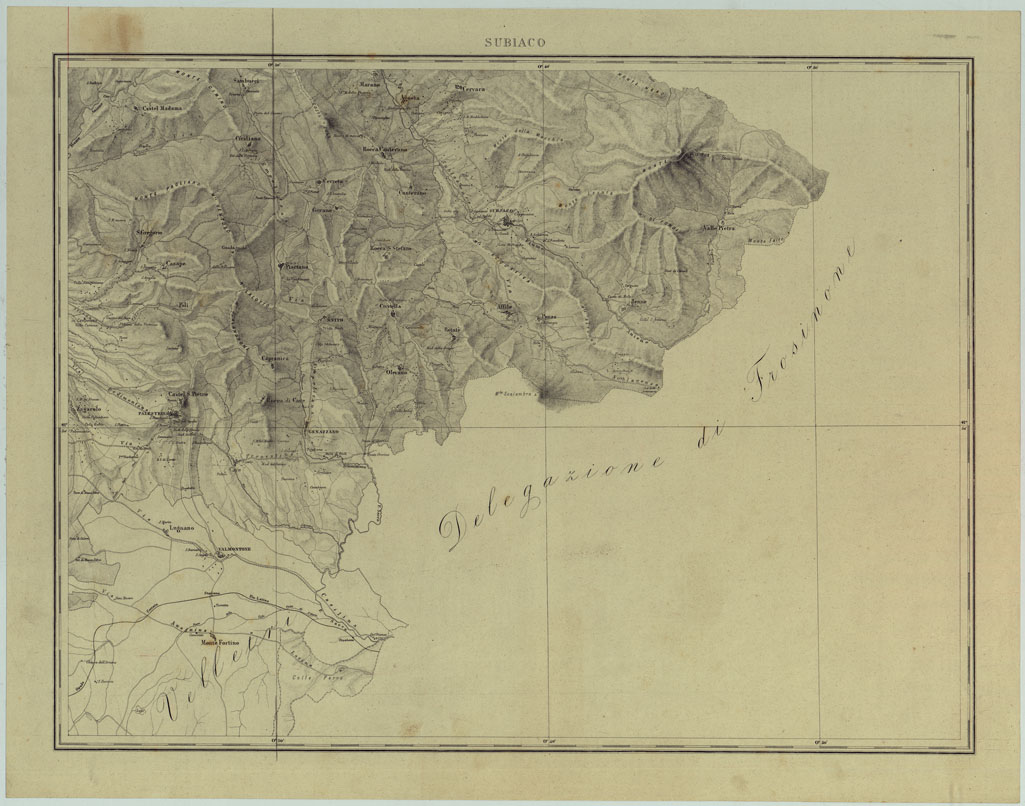 "Carta in nove fogli (dei quali uno per il titolo) incisi su rame alla Calcografia Camerale. I titoli sono: Roma, Civita-Castellana, Civita - Vecchia, Nettuno, Palo, Subiaco, Arsoli, Cisterna. Le longitudini sono calcolate dal meridiano della Cupola di S. Pietro in Vaticano. Ciascun foglio contiene 19' di latitudine e 34' di longitudine. La carta è basata sui rilievi catastali eseguiti in seguito al motu proprio del 1816. Fu pubblicata nel 1845. L'orografia è rappresentata con fine tratteggio a luce zenitale. Gli abitati sono distinti in base alla loro importanza amministrativa. Le strade sono distinte in sei classi comprese le ferrovie. Sono indicati i confini politici e amministrativi, i boschi, i vigneti, le saline, i punti trigonometrici, ecc. il foglio N° 1 contiene il titolo, la leggenda dei segni convenzionali, il quadro d'unione e le scale grafiche. Cfr. MORI A. La cartografia ufficiale in Italia e l'I.G.M., pag. 79. Quattro copie una delle quali montata su tela a stacchi. Carte uguali a questa si trovano inBiblioteca al n. 212 d'inventario generale ed al n. 4080 bis."