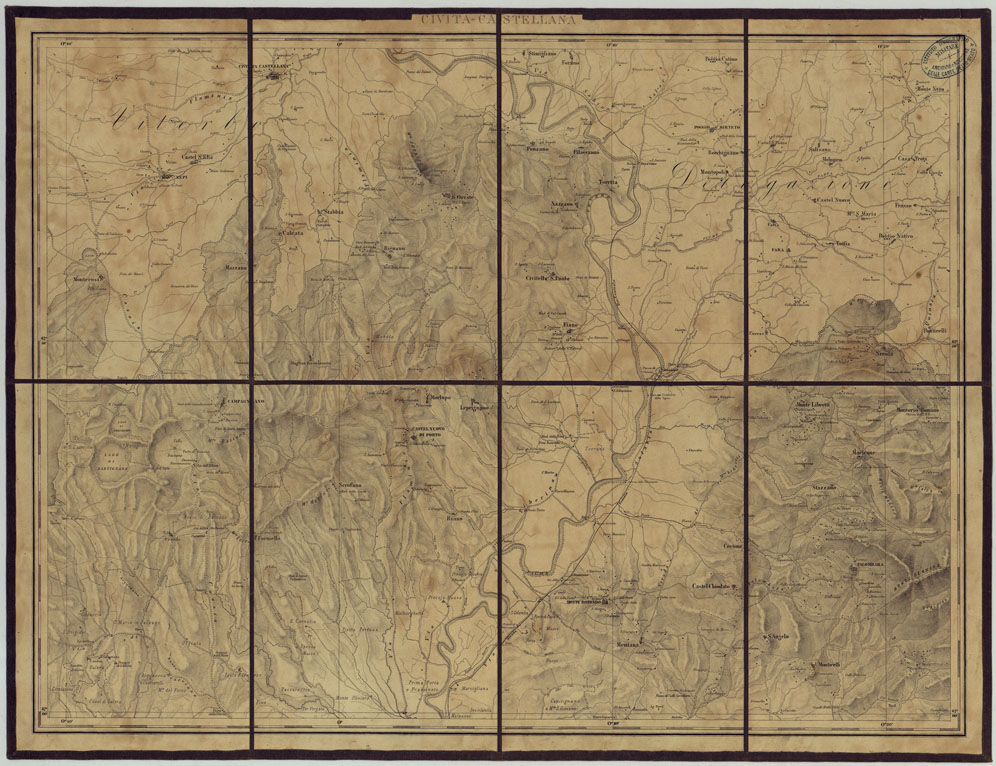 "Carta in nove fogli (dei quali uno per il titolo) incisi su rame alla Calcografia Camerale. I titoli sono: Roma, Civita-Castellana, Civita - Vecchia, Nettuno, Palo, Subiaco, Arsoli, Cisterna. Le longitudini sono calcolate dal meridiano della Cupola di S. Pietro in Vaticano. Ciascun foglio contiene 19' di latitudine e 34' di longitudine. La carta è basata sui rilievi catastali eseguiti in seguito al motu proprio del 1816. Fu pubblicata nel 1845. L'orografia è rappresentata con fine tratteggio a luce zenitale. Gli abitati sono distinti in base alla loro importanza amministrativa. Le strade sono distinte in sei classi comprese le ferrovie. Sono indicati i confini politici e amministrativi, i boschi, i vigneti, le saline, i punti trigonometrici, ecc. il foglio N° 1 contiene il titolo, la leggenda dei segni convenzionali, il quadro d'unione e le scale grafiche. Cfr. MORI A. La cartografia ufficiale in Italia e l'I.G.M., pag. 79. Quattro copie una delle quali montata su tela a stacchi. Carte uguali a questa si trovano inBiblioteca al n. 212 d'inventario generale ed al n. 4080 bis."