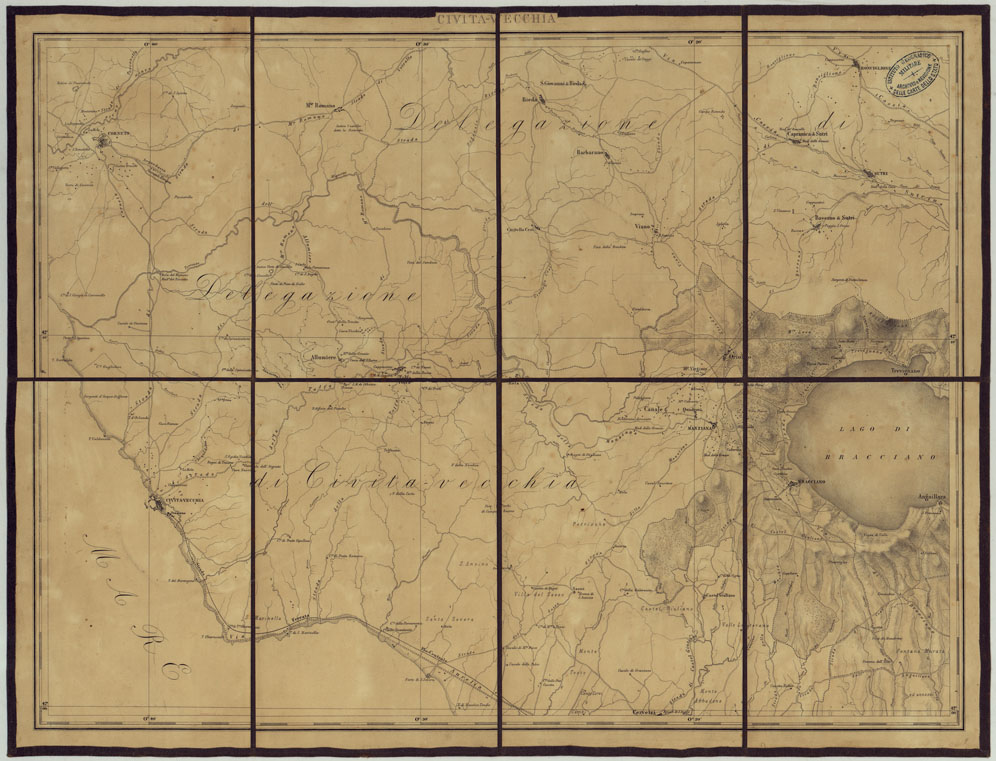 "Carta in nove fogli (dei quali uno per il titolo) incisi su rame alla Calcografia Camerale. I titoli sono: Roma, Civita-Castellana, Civita - Vecchia, Nettuno, Palo, Subiaco, Arsoli, Cisterna. Le longitudini sono calcolate dal meridiano della Cupola di S. Pietro in Vaticano. Ciascun foglio contiene 19' di latitudine e 34' di longitudine. La carta è basata sui rilievi catastali eseguiti in seguito al motu proprio del 1816. Fu pubblicata nel 1845. L'orografia è rappresentata con fine tratteggio a luce zenitale. Gli abitati sono distinti in base alla loro importanza amministrativa. Le strade sono distinte in sei classi comprese le ferrovie. Sono indicati i confini politici e amministrativi, i boschi, i vigneti, le saline, i punti trigonometrici, ecc. il foglio N° 1 contiene il titolo, la leggenda dei segni convenzionali, il quadro d'unione e le scale grafiche. Cfr. MORI A. La cartografia ufficiale in Italia e l'I.G.M., pag. 79. Quattro copie una delle quali montata su tela a stacchi. Carte uguali a questa si trovano inBiblioteca al n. 212 d'inventario generale ed al n. 4080 bis."