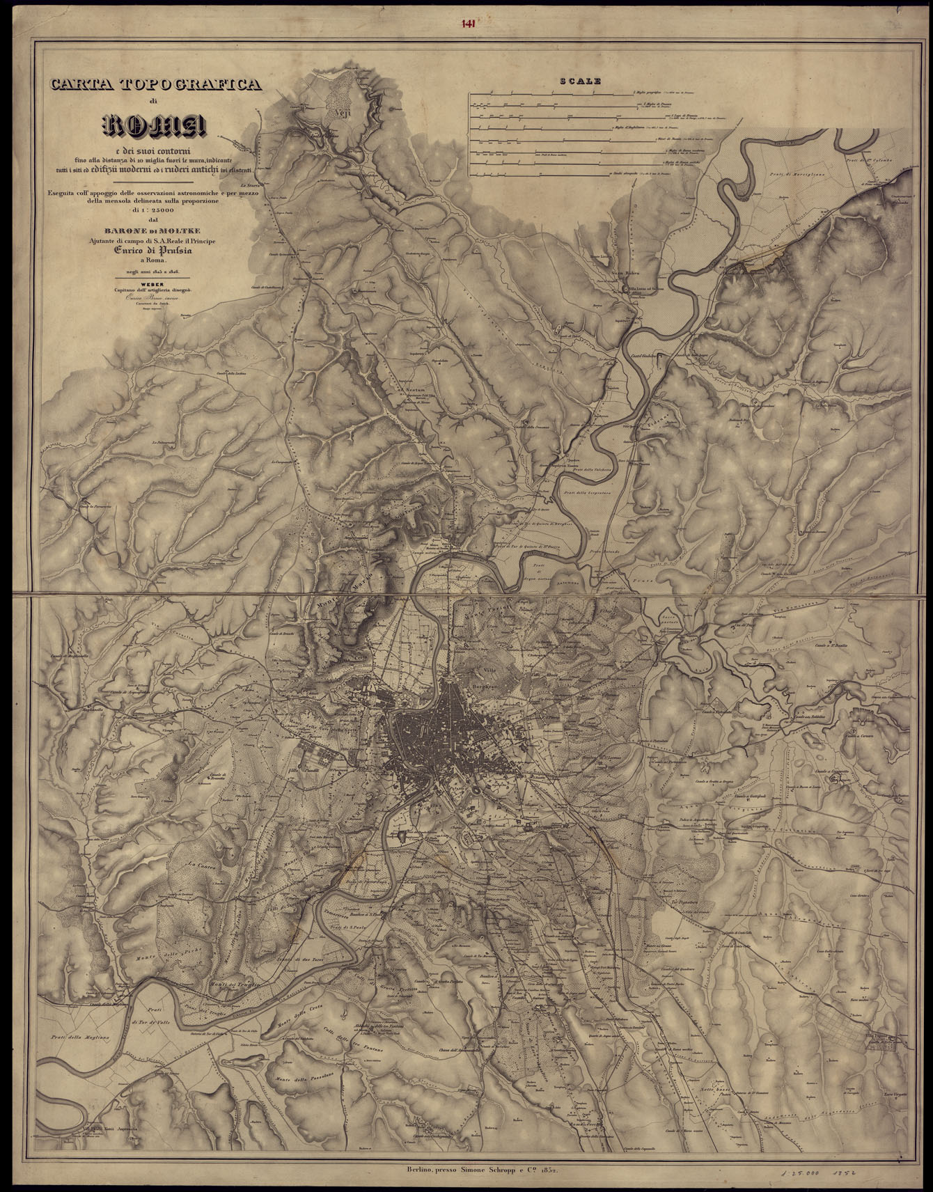 "E PER MEZZO DELLA MENSOLA DELINEATA SULLA PROPORZIONE DI 1:25.000 DAL BARONE DI MOLTRE AJUTANTE DI CAMPO DI S.A. REALE IL PRINCIPE ENRICO DI PRUSSIA A ROMA NEGLI ANNI 1845 E 1846. WEBER CAPITANO DELL'ARTIGLIERIA DISEGNO'. ENRICO BROSE INCISE. CARATTERI DA JAECK. HAMPE IMPRESSE. BERLINO, PRESSO SIMONE SHROPP E C. 1852. Carta in due fogli riuniti e montati su tela. Nitida incisione su rame con orografia rappresentata mediante il tratteggio. Si estende da Isola Farnese (nord) a Torre Vergata (sud) e da Maglianella (ovest) a Cervaretto (est). In alto a destra otto scale grafiche in misure antiche italiane ed estere. La copia N°16 è in due fogli montati su tela a stacchi con ricognizione della rete stradale eseguita nel 1872 dal Capo di S. M. Rosalba, come da nota monoscritta. La copia N°17 è una riproduzione in 4 fogli eseguita nel 1876 (?) dall' I.G.M."