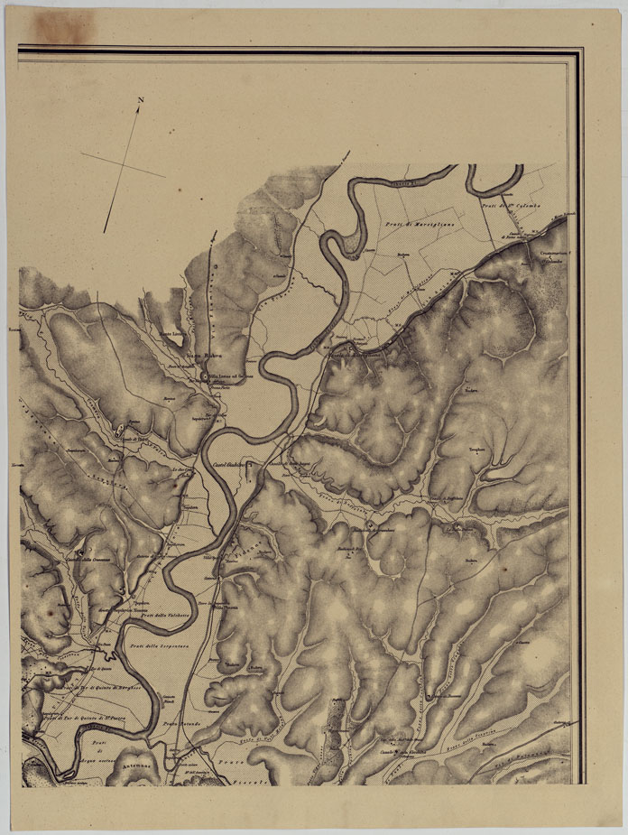 "E PER MEZZO DELLA MENSOLA DELINEATA SULLA PROPORZIONE DI 1:25.000 DAL BARONE DI MOLTRE AJUTANTE DI CAMPO DI S.A. REALE IL PRINCIPE ENRICO DI PRUSSIA A ROMA NEGLI ANNI 1845 E 1846. WEBER CAPITANO DELL'ARTIGLIERIA DISEGNO'. ENRICO BROSE INCISE. CARATTERI DA JAECK. HAMPE IMPRESSE. BERLINO, PRESSO SIMONE SHROPP E C. 1852. Carta in due fogli riuniti e montati su tela. Nitida incisione su rame con orografia rappresentata mediante il tratteggio. Si estende da Isola Farnese (nord) a Torre Vergata (sud) e da Maglianella (ovest) a Cervaretto (est). In alto a destra otto scale grafiche in misure antiche italiane ed estere. La copia N°16 è in due fogli montati su tela a stacchi con ricognizione della rete stradale eseguita nel 1872 dal Capo di S. M. Rosalba, come da nota monoscritta. La copia N°17 è una riproduzione in 4 fogli eseguita nel 1876 (?) dall' I.G.M."