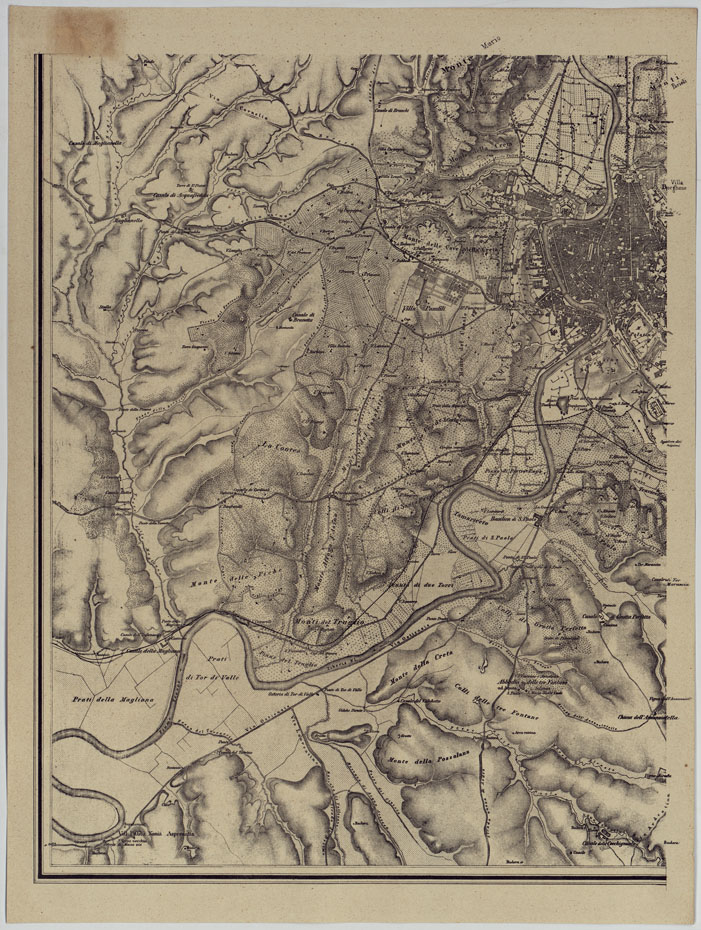 "E PER MEZZO DELLA MENSOLA DELINEATA SULLA PROPORZIONE DI 1:25.000 DAL BARONE DI MOLTRE AJUTANTE DI CAMPO DI S.A. REALE IL PRINCIPE ENRICO DI PRUSSIA A ROMA NEGLI ANNI 1845 E 1846. WEBER CAPITANO DELL'ARTIGLIERIA DISEGNO'. ENRICO BROSE INCISE. CARATTERI DA JAECK. HAMPE IMPRESSE. BERLINO, PRESSO SIMONE SHROPP E C. 1852. Carta in due fogli riuniti e montati su tela (Files A0001310-11) delle dimensioni complessive sopra indicate. Nitida incisione su rame con orografia rappresentata mediante il tratteggio. Si estende da Isola Farnese (nord) a Torre Vergata (sud) e da Maglianella (ovest) a Cervaretto (est). In alto a destra otto scale grafiche in misure antiche italiane ed estere. La copia N°16 (Files A0001312-13) è in due fogli montati su tela a stacchi con ricognizione della rete stradale eseguita nel 1872 dal Capo di S. M. Rosalba, come da nota monoscritta. La copia N°17 (Files A0001314-17)è una riproduzione in 4 fogli eseguita nel 1876 (?) dall' I.G.M."