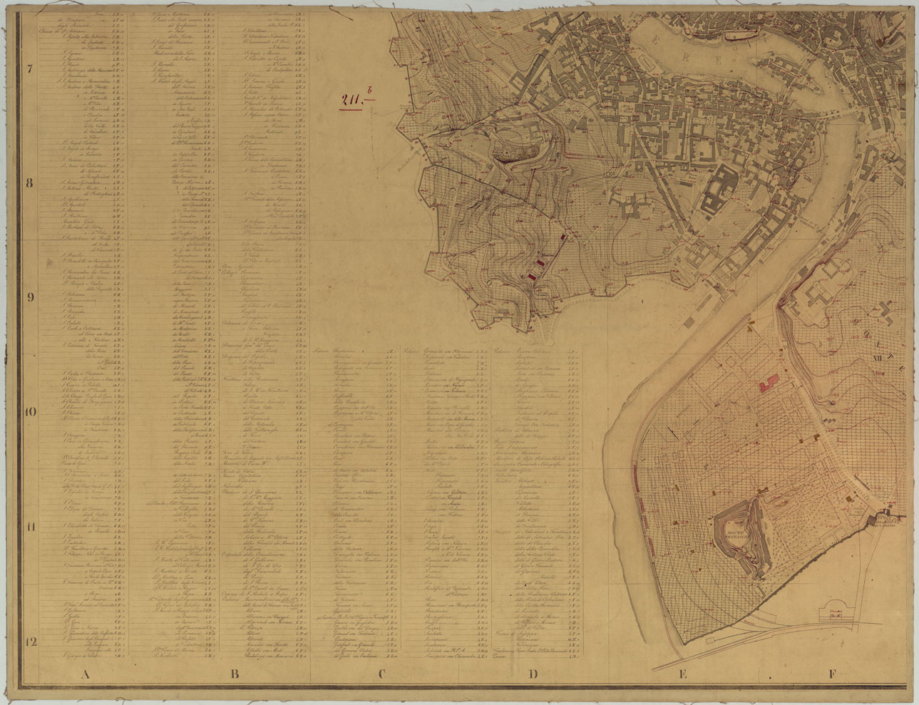 "Quattro fogli montati su tela. Grande pianta, incisa, con rilievo orografico rappresentato col tratteggio, sussidiata da ricco elenco numerico-alfabetico degli edifici pubblici. La copia n. 18 reca tracciate a mano curve di livello alla equidistanza di m. 1 (giallo) e di m. 5 (rosso) e distingue i fabbricati nuovi fino al 1870 (rosso) e quelli da demolire (giallo) come nota manoscritta."