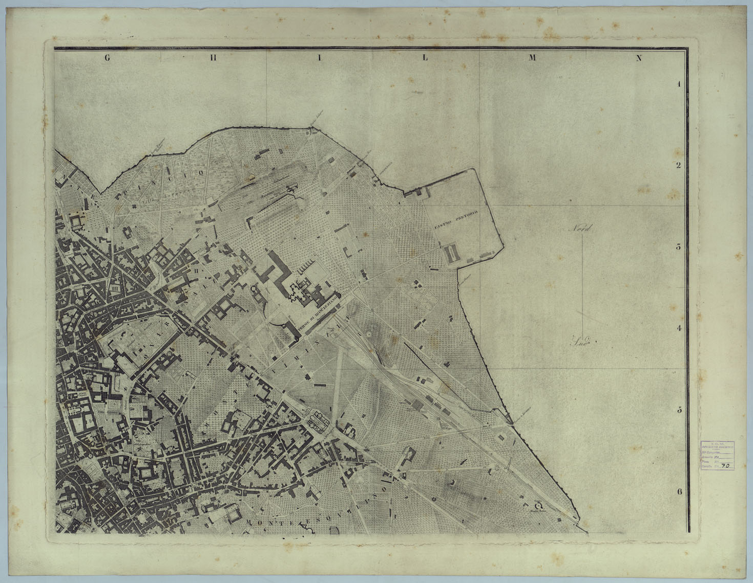 "Quattro fogli montati su tela. Grande pianta, incisa, con rilievo orografico rappresentato col tratteggio, sussidiata da ricco elenco numerico-alfabetico degli edifici pubblici. La copia n. 18 reca tracciate a mano curve di livello alla equidistanza di m. 1 (giallo) e di m. 5 (rosso) e distingue i fabbricati nuovi fino al 1870 (rosso) e quelli da demolire (giallo) come nota manoscritta."