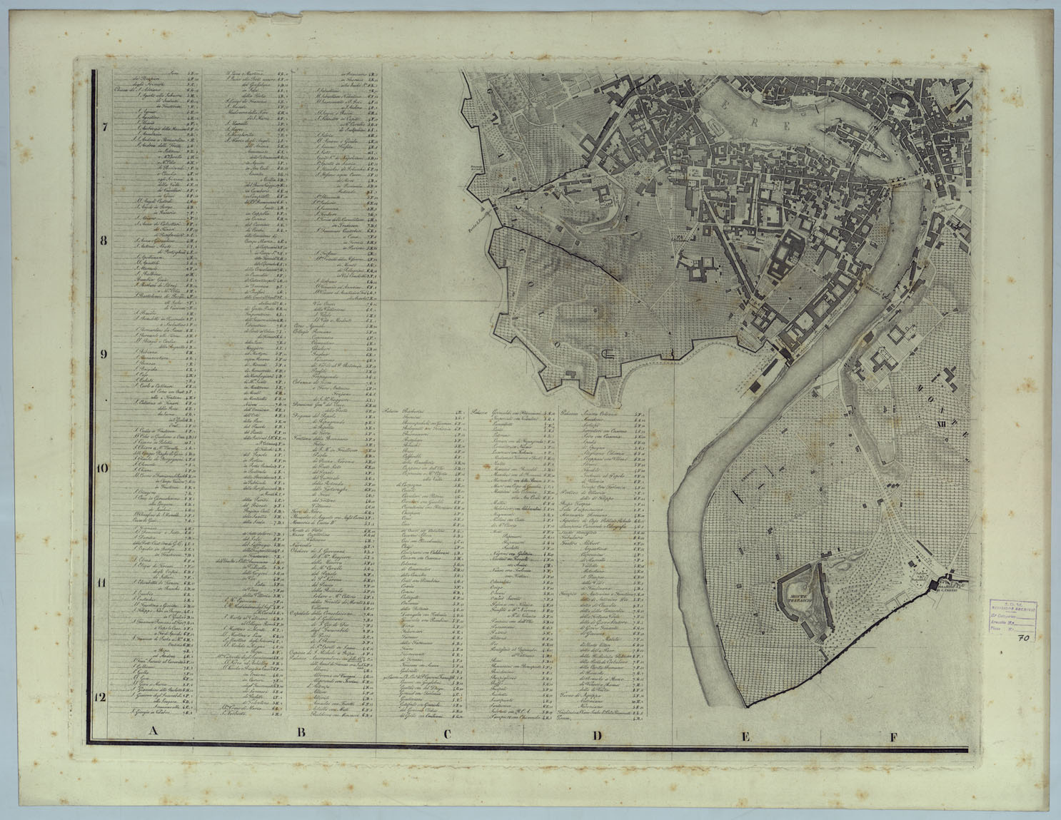 "Quattro fogli montati su tela. Grande pianta, incisa, con rilievo orografico rappresentato col tratteggio, sussidiata da ricco elenco numerico-alfabetico degli edifici pubblici. La copia n. 18 reca tracciate a mano curve di livello alla equidistanza di m. 1 (giallo) e di m. 5 (rosso) e distingue i fabbricati nuovi fino al 1870 (rosso) e quelli da demolire (giallo) come nota manoscritta."