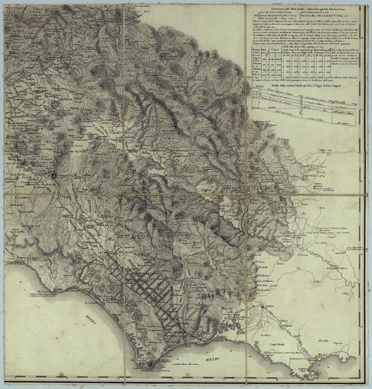 "Carta in quattro fogli montati su tela a stacchi incisa da G. B. Bordiga, edita in Milano da Antonio Vallardi (Cnfr. F: Porena, Primo contributo di cartografia romana in Rivista Geografica Italiana, 1894). E' ritenuta la prima carta del Lazio in cui l'orografia è rappresentata col tratteggio. Distingue gli abitati secondo la loro importanza amministrativa e il numero degli abitanti, indicando inoltre vescovadi, abbadie, rovine, luoghi di battaglia, bagni, luoghi di posta, ponti, castelli, ecc., strade, acquedotti, confini, il nome antico degli abitati e la data della loro fondazione, ecc., ecc. Il foglio nord-occidentale contiene una cartina di Roma col tracciato delle mura in varie epoche il foglio sud-occidentale contiene la leggenda dei segni convenzionali, le scale grafiche (miglia italiane, romane, moderne e antiche) ed alcune osservazioni sul Tevere. Il foglio sud-orientale contiene osservazioni sulle Paludi Pontine. Annessi due fogli contenenti, l'uno notizie cronologiche, un quadro delle distanze tra i luoghi principali e i dati relativi alla popolazione, una tavola di misure e la riproduzione del Lazio della Tavola Peutingeriana l'altro una cartina dell'Italia settentrionale e centrale intitolata "Italia Postale" che serve anche di quadro d'unione, e una tavola delle Altezze. La copia della Collezione Bianconi è in foglio unico montato su tela a stacchi."