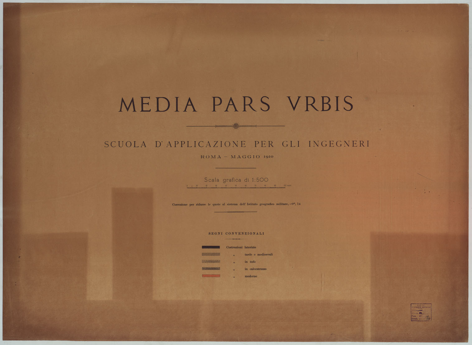 R. ACCADEMIA DEI LINCEI. PROF. VINCENZO REINA MEDIA PARS VRBIS RILIEVO PLANIMETRICO ED ALTIMETRICO ESEGUITO DAGLI ALLIEVI DELLA SCUOLA D'APPLICAZIONE PER GLI INGEGNERI IN ROMA COLLA GUIDA DEL PROF. U. BARBIERI DELL'ING. C. CASSINIS. ROMA.