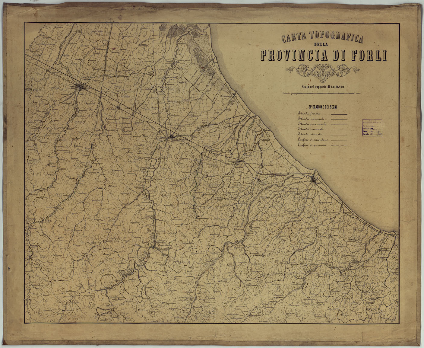 "TESSUTA SOPRA UNA NUOVA RETE TRIGONOMETRICA COL MATERIALE DELLE MAPPE CATASTALI AGGIORNATE E RIDOTTE ALLA PROPORZIONE DI 1:50.000 SOTTO LA DIREZIONE DI UNA COMMISSIONE COMPOSTA DELL'INGEGNERE DAVIDE ANGELI, GIOVANNI MERLONI, FRANCESCO ANGELI E PUBBLICATA A SPESE DELLA PROVINCIA. NELL'ANNO 1888. STAB. LIT. THUMB, BOLOGNA. Questa carta è archiviata con il documento n. 28, a cui si riferiscono la descrizione seguente e la data, ma non ne è menzionata. Carta in 16 fogli oltre un quadro d'unione. Venne costruita sulla base di una rete trigonometrica appositamente stesa. Proiezione adottata quella di Flamstead, modificata da Bonne. Longitudini calcolate dal meridiano dell'isola del Ferro. La Topografia venne ricavata per la Provincia di Forlì e parte di quella di Ravenna, dalle Mappe del Catasto Romano ridotte col pantografo dalla scala di 1:2.000 a quella di 1:10.000 e poi aggiornate a cura dei singoli comuni e della Provincia, per il territorio di S. Marino dalle mappe catastali locali, per la Provincia Pesarese da una " Corografia" alla scala di 1:32.000 conservata al Catasto in Roma e per le Provincie di Firenze ed Arezzo da " Corografie" al 20.000 e al 25.000 conservate presso la Direzione del Censimento della Toscana. La carta è stampata in nero: essa rappresenta l'orografia a mezzo di nitido tratteggio: indica abitati, ferrovie (in esercizio, in costruzione, approvate in massima), strade (nazionali, provinciali, comunali, vicinali), miniere acque minerali e termali, cave di pietra, molini, parrocchie, cimiteri, oratori, ecc., i confini di Stato, di Provincia, circondario, mandamento, di comune. Il foglio N° 1 contiene il titolo, piantine di città, un quadro delle coordinate e della altimetria dei luoghi e delle elevazioni principali, dati sulla popolazione, e sulla rete stradale e infine la leggenda dei segni convenzionali. Il foglio N° VIII reca delle " Annotazioni sulla formazione della carta". I fogli N.i IV, XIII e XVI contengono rispettivamente le piante di Rimini, Forlì e Cesena e numerose altre piantine con dati geografici e statistici. Il quadro d'unione è alla scala di 1:200 000 e contiene numerose piantine di abitati. La stessa carta è presente in Biblioteca al numero d'Inv. Gen. 165 - n. 91 d'Ordine - Files B0002224- 2240."