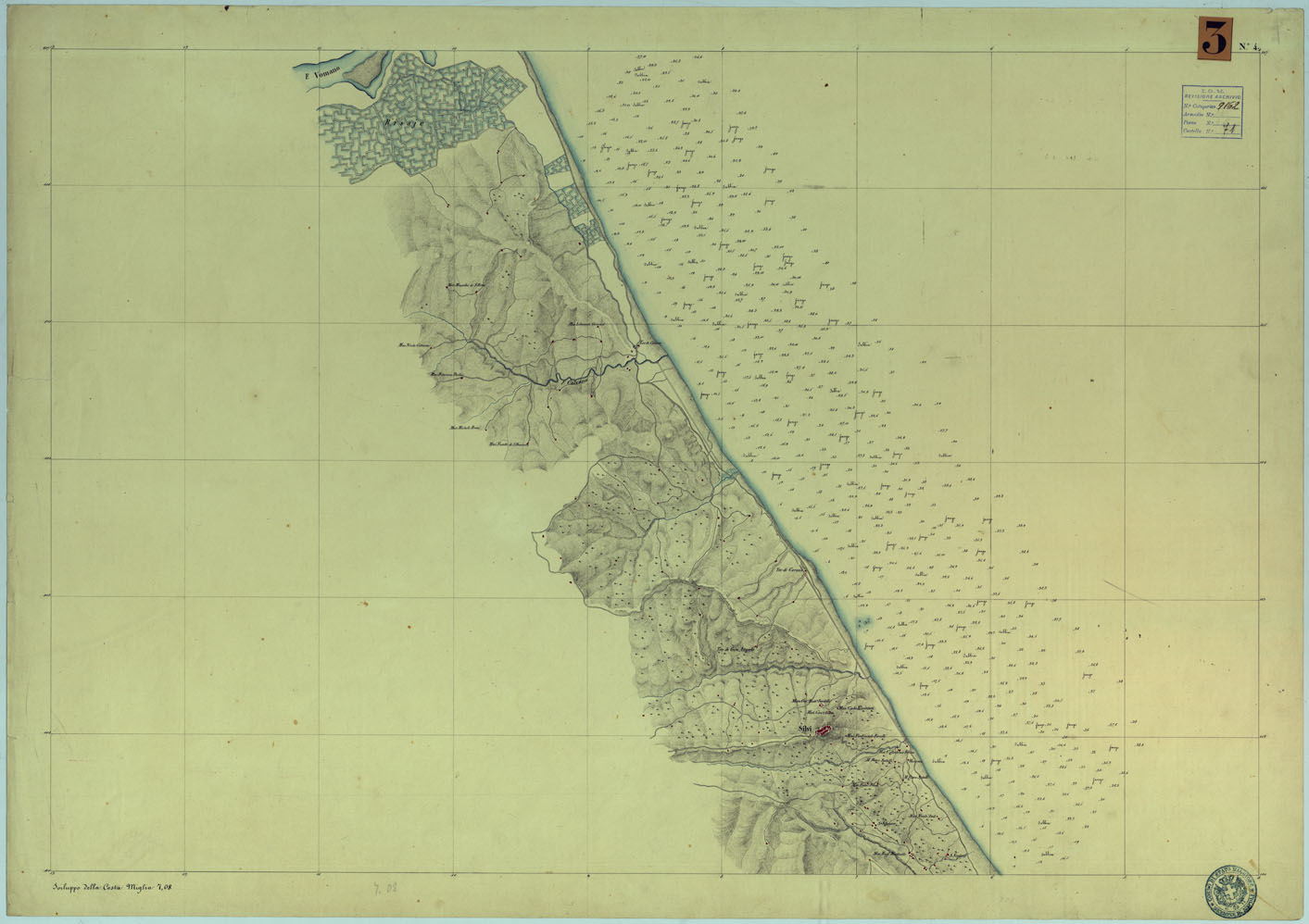 "Sono le levate originali eseguite lungo il litorale adriatico, col concorso dell'idrografo inglese W. Smith, su la base dei rilievi trigonometrici compiuti nel 1817-19 dall'Officio Topografico di Napoli a seguito di quelli già iniziati dagli Ingegneri Geografi del Regno Italico. Sono 44 fogli accuratamente disegnati a penna nello stesso R. Officio Topografico di Napoli. Essi servirono per la "carta di Cabotaggio della Costa del Regno delle Due Sicilie" al 100.000 pubblicata nel 1834. Rappresentano l'orografia con fine tratteggio, abitati e strade in rosso, acque in azzurro, colture e vegetazioni in verde. Gli scandagli sono calcolati in metri e si estendono a 2 Km. dalla costa. La topografia si estende pure per 2 Km. entro terra. Annesso un quadro d'unione. Cfr. Mori A., La Cartografia ufficiale in Italia e l'I.G.M., 1922, pagg. 100-101."