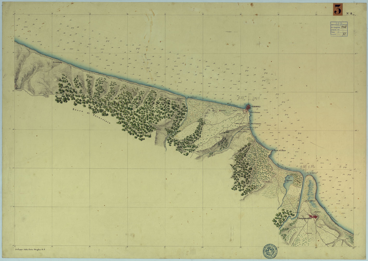 "Sono le levate originali eseguite lungo il litorale adriatico, col concorso dell'idrografo inglese W. Smith, su la base dei rilievi trigonometrici compiuti nel 1817-19 dall'Officio Topografico di Napoli a seguito di quelli già iniziati dagli Ingegneri Geografi del Regno Italico. Sono 44 fogli accuratamente disegnati a penna nello stesso R. Officio Topografico di Napoli. Essi servirono per la "carta di Cabotaggio della Costa del Regno delle Due Sicilie" al 100.000 pubblicata nel 1834. Rappresentano l'orografia con fine tratteggio, abitati e strade in rosso, acque in azzurro, colture e vegetazioni in verde. Gli scandagli sono calcolati in metri e si estendono a 2 Km. dalla costa. La topografia si estende pure per 2 Km. entro terra. Annesso un quadro d'unione. Cfr. Mori A., La Cartografia ufficiale in Italia e l'I.G.M., 1922, pagg. 100-101."