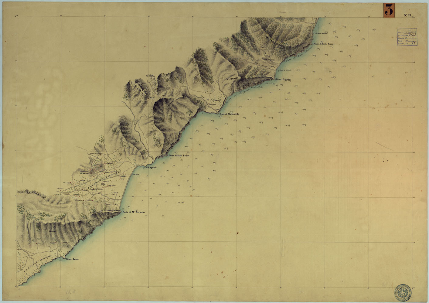 "Sono le levate originali eseguite lungo il litorale adriatico, col concorso dell'idrografo inglese W. Smith, su la base dei rilievi trigonometrici compiuti nel 1817-19 dall'Officio Topografico di Napoli a seguito di quelli già iniziati dagli Ingegneri Geografi del Regno Italico. Sono 44 fogli accuratamente disegnati a penna nello stesso R. Officio Topografico di Napoli. Essi servirono per la "carta di Cabotaggio della Costa del Regno delle Due Sicilie" al 100.000 pubblicata nel 1834. Rappresentano l'orografia con fine tratteggio, abitati e strade in rosso, acque in azzurro, colture e vegetazioni in verde. Gli scandagli sono calcolati in metri e si estendono a 2 Km. dalla costa. La topografia si estende pure per 2 Km. entro terra. Annesso un quadro d'unione. Cfr. Mori A., La Cartografia ufficiale in Italia e l'I.G.M., 1922, pagg. 100-101."