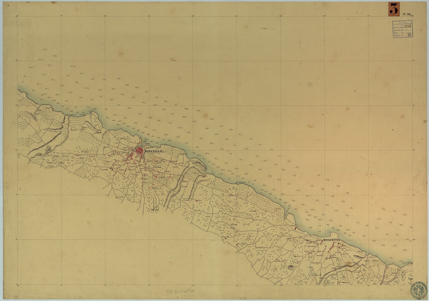 "Sono le levate originali eseguite lungo il litorale adriatico, col concorso dell'idrografo inglese W. Smith, su la base dei rilievi trigonometrici compiuti nel 1817-19 dall'Officio Topografico di Napoli a seguito di quelli già iniziati dagli Ingegneri Geografi del Regno Italico. Sono 44 fogli accuratamente disegnati a penna nello stesso R. Officio Topografico di Napoli. Essi servirono per la "carta di Cabotaggio della Costa del Regno delle Due Sicilie" al 100.000 pubblicata nel 1834. Rappresentano l'orografia con fine tratteggio, abitati e strade in rosso, acque in azzurro, colture e vegetazioni in verde. Gli scandagli sono calcolati in metri e si estendono a 2 Km. dalla costa. La topografia si estende pure per 2 Km. entro terra. Annesso un quadro d'unione. Cfr. Mori A., La Cartografia ufficiale in Italia e l'I.G.M., 1922, pagg. 100-101."